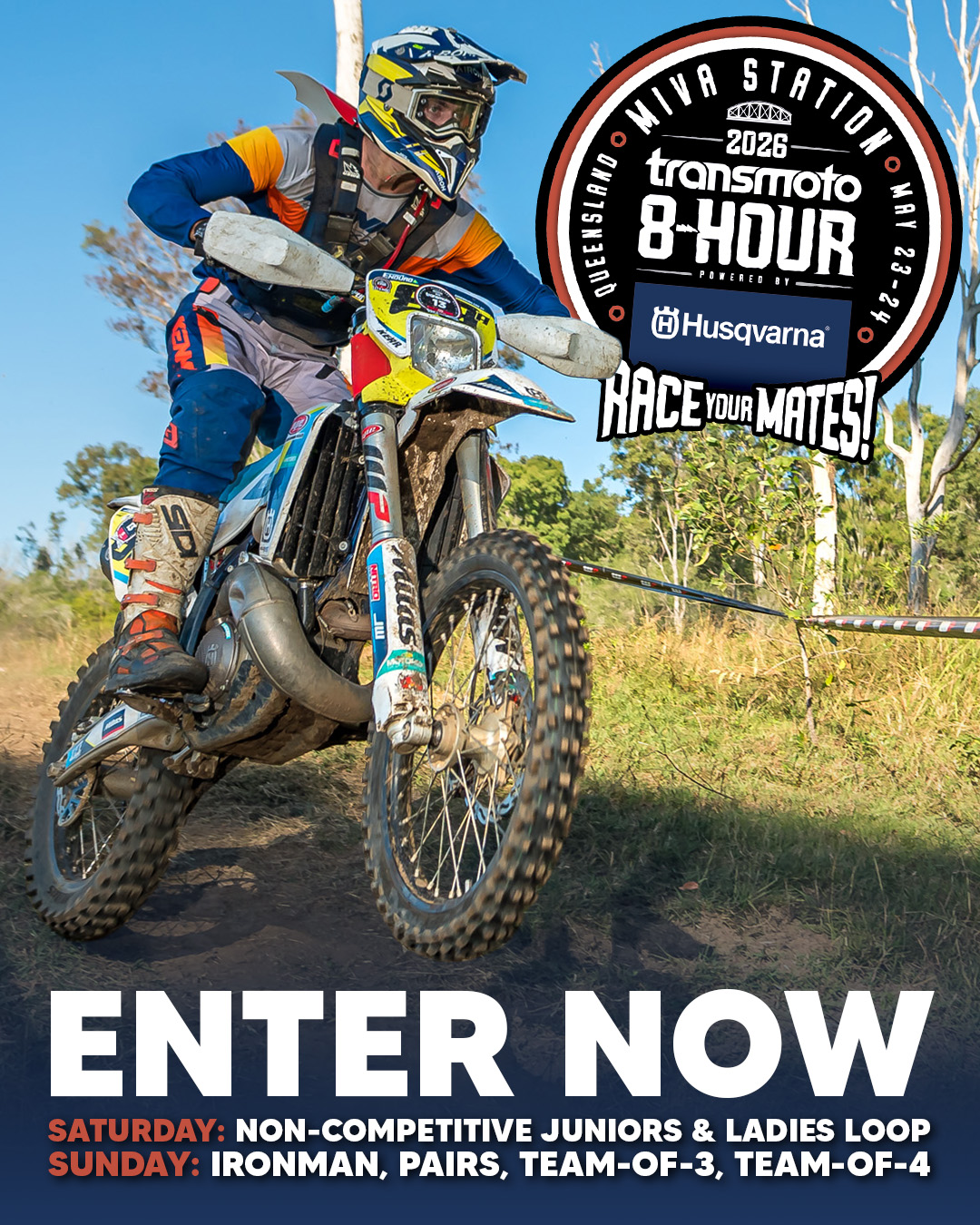 Entries for the 2026 Transmoto 8-Hour at Miva Station, Qld, powered by Husqvarna (to be held on May 23-24) are now open!